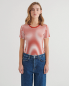 Das Ludmilla SS O-Neck von Basic Apparel in Roibus und Whisper White ist dein neuer Go-to für jeden Tag. Nachhaltige Bio-Baumwolle gemischt mit Elasthan sorgt für geschmeichelte Passform. Der angenehme Rib-Jersey fühlt sich weich an, die Slim-Fit-Silhouette schmeichelt, und der klassische runde Ausschnitt passt zu allem.